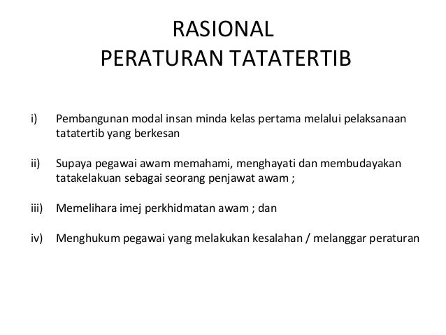 Berdasarkan Peraturan-peraturan Pegawai Awam Kelakuan dan Tatatertib 1993 ada dinyatakan dalam Peraturan 5. Peraturan-peraturan pegawai awam kelakuan dan tatat 1. Buku Panduan Bagi Warga Perkhidmatan Awam ini mengandungi ringkasan ke atas peraturan-peraturan perkhidmatan yang berkuatkuasa dan buku handbook ini khusus diterbitkan bagi warga yang baru berkhidmat dalam perkhidmatan awam dari semua peringkat sebagai panduan asas ke atas.