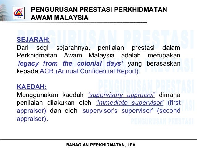 PENGURUSAN PRESTASI PERKHIDMATAN AWAM MALAYSIASEJARAHDari segi sejarahnya penilaian prestasi dalamPerkhidmatan Awam Malaysia adalah merupakanlegacy from the colonial days yang berasaskankepada ACR Annual Confidential ReportKAEDAHMenggunakan kaedah supervisory appraisal dimanapenilaian dilakukan oleh immediate supervisor firstappraiser. Ini penting untuk membolehkan prestasi pegawai diukur dengan lebih objektif. Penilaian prestasi bagi kakitangan awam khususnya guru dijalankan secara formal iaitu melalui penyediaan Sasaran Kerja Tahunan SKT dan Laporan Penilaian Prestasi Tahunan LPPT dan tidak formal iaitu melalui pemerhatian pihak pengurusan terhadap tingkahlaku penampilan sikap kemahiran dan lain- lain sepanjang tahun penilaian.