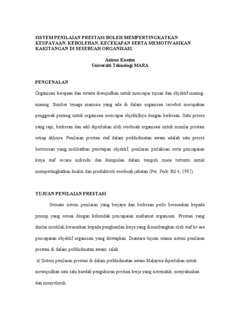 Topik penilaian prestasi seringkali hangat diperkatakan jika penjawat awam mendapat markah yang rendah dari pihak penilai. Interested in flipbooks about SISTEM PENILAIAN PRESTASI PEGAWAI PERKHIDMATAN AWAM DI BAWAH SARAAN BARU PERKHIDMATAN AWAM. Kaedah Penilaian prestasi perlu mempunyai ciri-ciri seperti berikut.