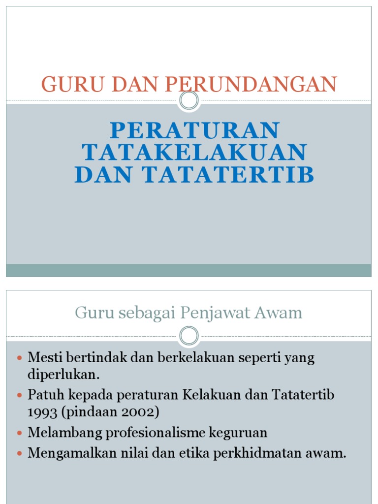 PERATURAN-PERATURAN PEGAWAI AWAM KELAKUAN DAN TATATERTIB 1993 PU. Peraturan kelakuan dan tatatertibsebagai penjawat awam guru mesti. A 3961993 Dalam menjalankan tugas pegawai dibekalkan dengan kuasaIa perlu dikawal bagi mengelakkan penyelewenagn dan menyalahgunakan kuasa untuk kepentingan peribadi Setiap masa pegawai hendaklah menjaga tingkahlaku perbuatan supaya nama baik perkhidmatan awam tidak terjejas RASIONAL PERATURAN TATATERTIB i Pembangunan modal insan minda kelas pertama melalui pelak tatatertib yang berkesan ii Supaya pegawai awam memahami menghayati dan membuda tatakelakuan sebagai seorang penjawat.
